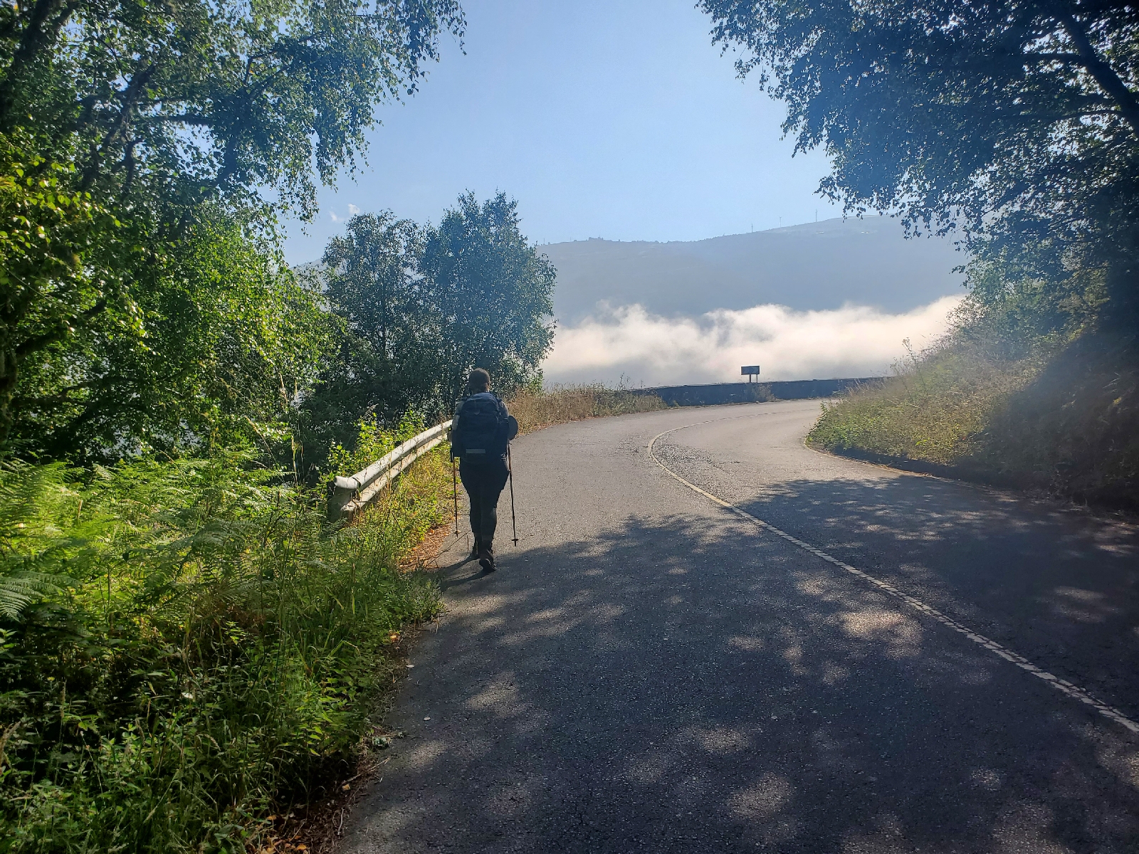 From the crest of the hill, we were rewarded with a stunning view down to the Embalse de Salime, a vast reservoir created by the damming of the Navia River. Below us, the valley was blanketed in a slow rolling sea of clouds, their tops kissed by the morning sun. The descent into this ethereal landscape was steep and challenging, but the beauty of the cloud-covered valley below kept our spirits high.